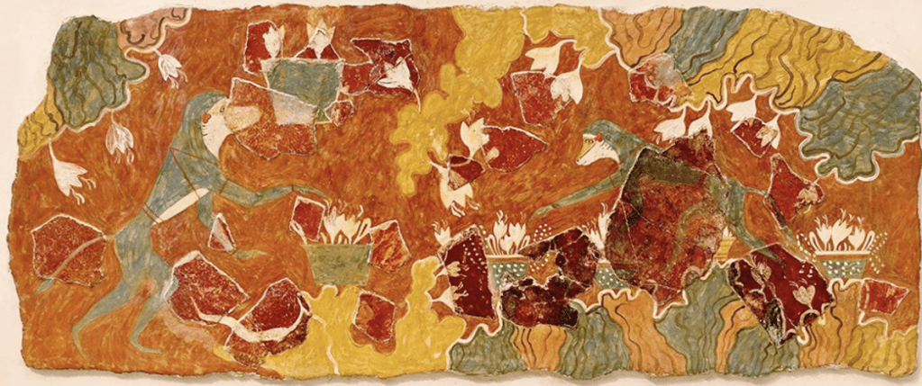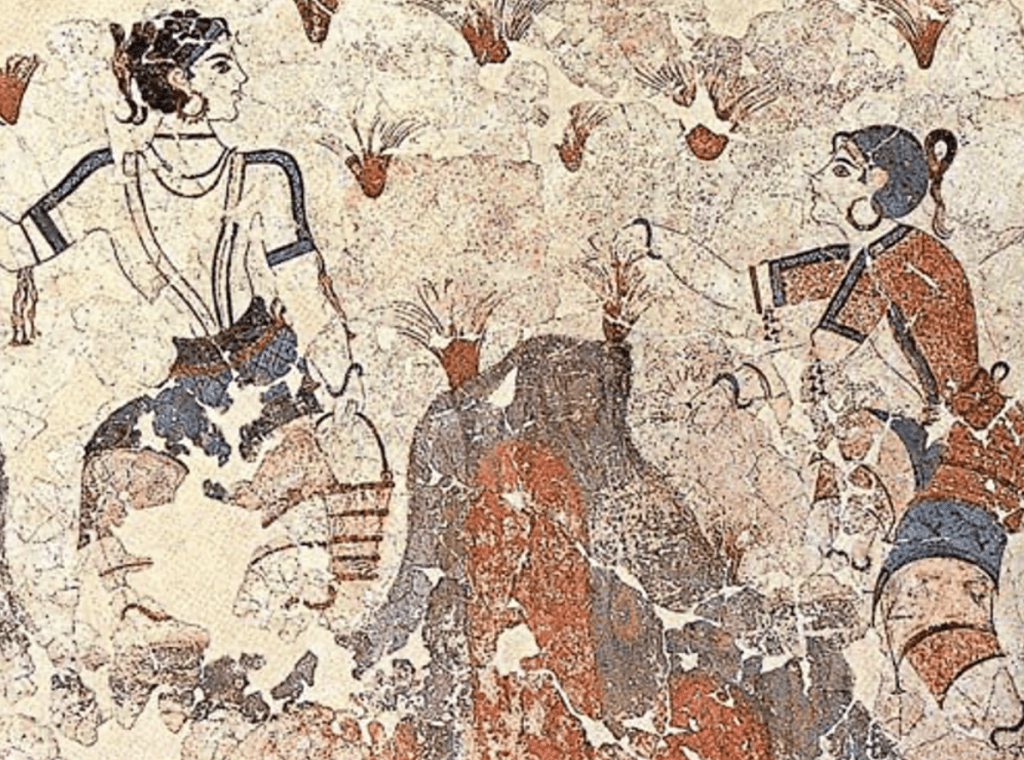 Pinterest’te bile kolaylıkla bulabileceğiniz bu resimde de Akrotiri alanındaki Xeste 3 binasının (MÖ 1600-1500) duvarlarında yer alan “Safran Toplayıcıları” freskini görmektesiniz.
