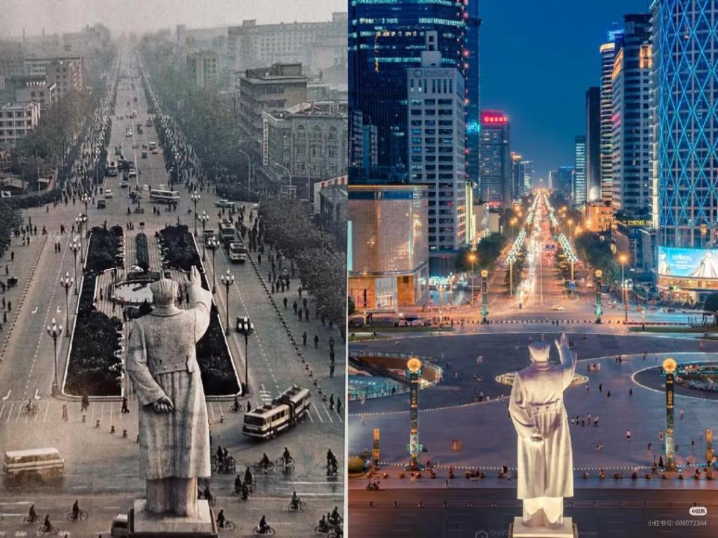 Bu görselin solundaki görüntü, Chengdu’nun o dönemki tipik şehir planlamasını, eski toplu taşıma araçlarını ve geniş caddelerini gösteriyor. Bu görüntü büyük olasılıkla doğru. Sağdaki görüntüde ise gökdelenler, ışıklandırmalar, genişleyen şehir yapısı gösteriliyor. Fakat burada bazı gökdelen ve ışıklandırmalara dijital eklemeler yapılmış olabilir. Bundan dolayı bu görüntü birebir bir tarihsel doğruluk sunmuyor olabilir.