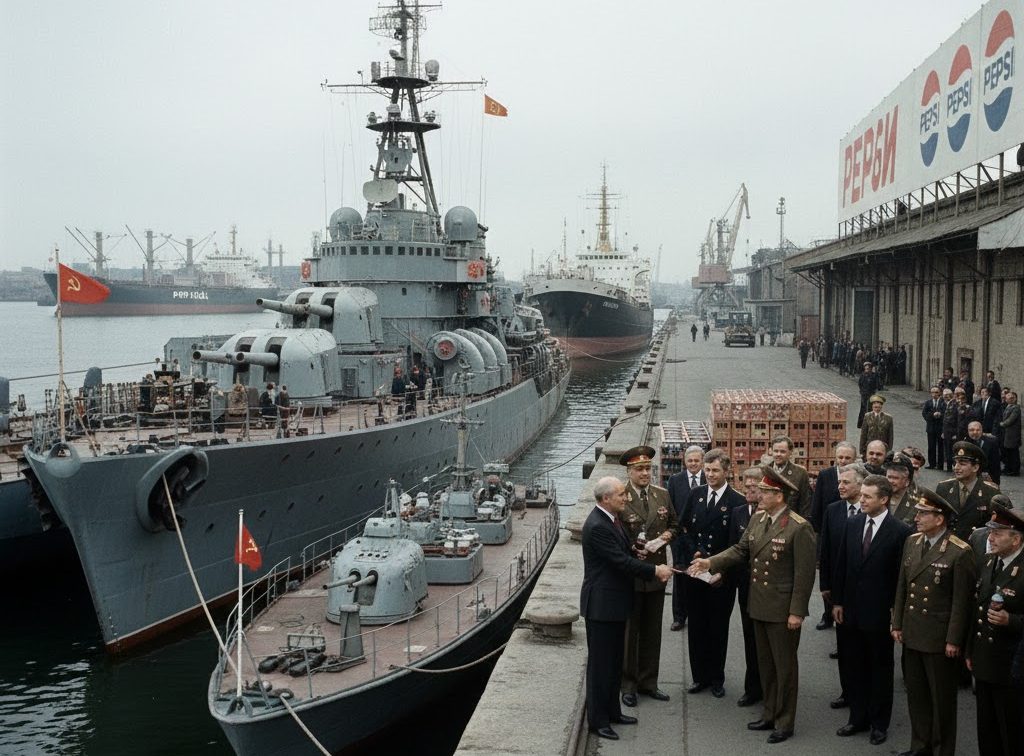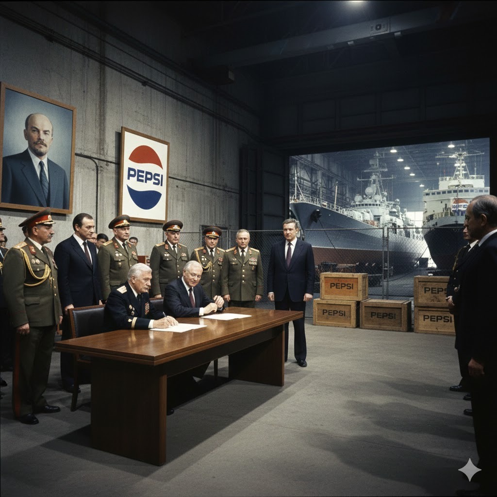 1989 yılında SSCB’nin ruble’nin uluslararası alanda geçerli olmaması nedeniyle nakit ödeme yapamadığı bir gerçek. Bu yüzden de PepsiCp ile bir takas anlaşması yapmış. Bu anlaşmaya göre, Sovyet donanasından 17 hizmet dışı denizaltı ile beraber bir kruvazör, bir fırkateyn ve bir muhrip gibi savaş gemilerinin devredildiği iddia ediliyor.